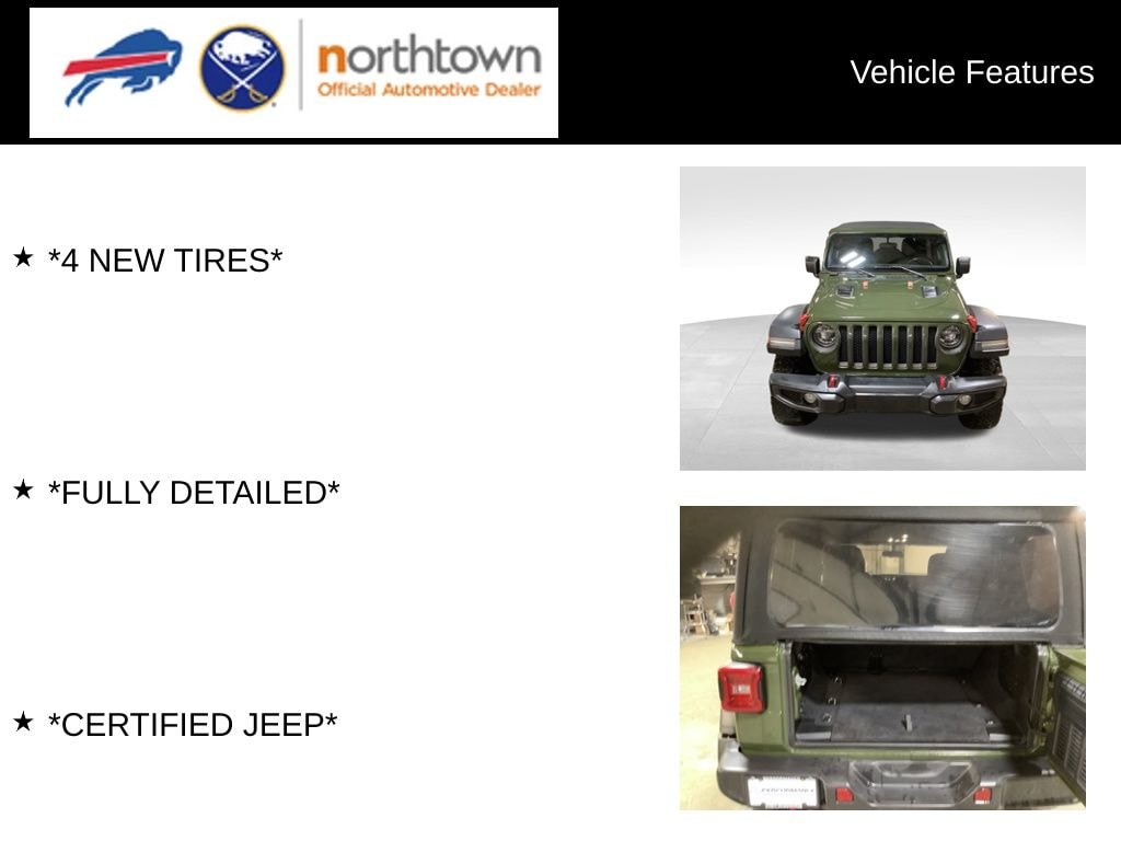 See the rest of our inventory at NorthtownCDJ.com LED Lighting Group (Daytime Running Lamps LED Accents, Front LED Fog Lamps, LED Premium Reflector Headlamps, and LED Taillamps), Quick Order Package 22R, 4-Wheel Disc Brakes, 4.10 Rear Axle Ratio, 8 Speakers, ABS brakes, Air Conditioning, Alloy wheels, AM/FM radio: SiriusXM, Apple CarPlay/Android Auto, Automatic temperature control, Aux Battery, Brake assist, Compass, Delay-off headlights, Driver door bin, Driver vanity mirror, Dual front impact airbags, Dual front side impact airbags, Electronic Stability Control, Front anti-roll bar, Front Bucket Seats, Front Center Armrest w/Storage, Front dual zone A/C, Front fog lights, Front reading lights, Fully automatic headlights, Garage door transmitter, Glass Window Material, Heated door mirrors, Illuminated entry, Integrated roll-over protection, Leather steering wheel, Low tire pressure warning, Non-Lock Fuel Cap w/o Discriminator, Occupant sensing airbag, Outside temperature display, Panic alarm, ParkView Rear Back-Up Camera, Passenger door bin, Passenger vanity mirror, Performance Suspension, Power door mirrors, Power steering, Power windows, Premium Black Sunrider Soft Top, Premium Cloth Low-Back Bucket Seats, Radio data system, Radio: Uconnect 4 w/7" Display, Rear anti-roll bar, Rear reading lights, Remote keyless entry, Remote Proximity Keyless Entry, Remote Start System, Security system, Speed control, Split folding rear seat, Steering wheel mounted audio controls, Stop-Start Dual Battery System, Tachometer, Telescoping steering wheel, Tilt steering wheel, Traction control, Trip computer, Variably intermittent wipers, Voltmeter, and Wheels: 17" x 7.5" Machined w/Black PocketS.