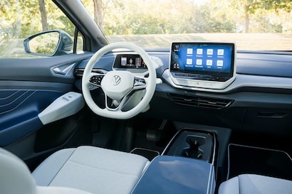 The interior of the ID.4 is spacious and welcoming while feeling modern and high-tech. The seats are supportive and comfortable. A large infotainment touchscreen puts all your most-used functions, like your AC, music, and phone contacts, right at the tips of your fingers. It holds five travelers in a roomy cabin and offers more cargo space than many rivals.