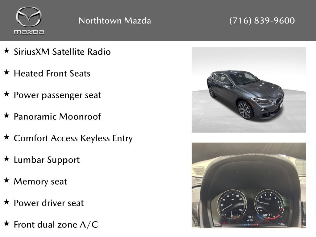 Mineral Grey Metallic 2018 BMW X2 xDrive28i AWD 8-Speed Automatic 2.0L 4-Cylinder DOHC 16V TwinPower Turbo Auto-Dimming Interior & Exterior Mirrors, Auto-Dimming Rear-View Mirror, Comfort Access Keyless Entry, Convenience Package, Exterior Parking Camera Rear, Front dual zone A/C, Heated door mirrors, Heated Front Seats, Heated Steering Wheel, Knee airbag, Lumbar Support, Memory seat, Panoramic Moonroof, Parking Assistant, Power driver seat, Power Liftgate, Power passenger seat, Power-Folding Mirrors, Rain sensing wipers, SiriusXM Satellite Radio, Universal Garage-Door Opener.