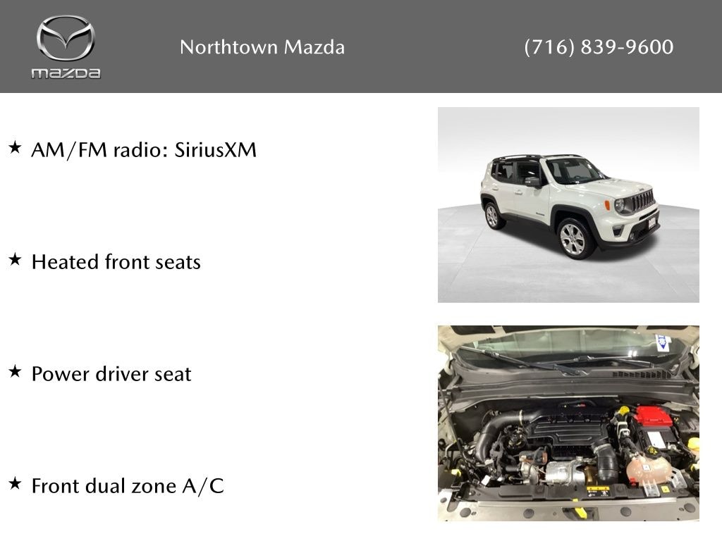 Alpine White Clearcoat 2020 Jeep Renegade Limited 4WD 9-Speed 948TE Automatic 1.3L I4 AM/FM radio: SiriusXM, Apple CarPlay/Android Auto, Brake assist, Front dual zone A/C, Heated front seats, Heated steering wheel, Knee airbag, Leather steering wheel, ParkView Rear Back-Up Camera, Power driver seat, Rain sensing wipers.