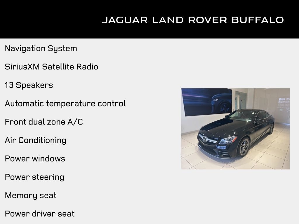 Black 2023 Mercedes-Benz C-Class C 43 AMG® 4MATIC® 4MATIC® 9-Speed Automatic 3.0L V6 BiTurbo 4MATIC®, 10.25" Media Display w/Central Controller, 13 Speakers, 4-Way Lumbar Support, ABS brakes, Adaptive suspension, Air Conditioning, Apple CarPlay®/Android Auto®, Auto High-beam Headlights, Auto tilt-away steering wheel, Automatic temperature control, Brake assist, Delay-off headlights, Dual front impact airbags, Dual front side impact airbags, Emergency communication system: Mercedes-Benz Emergency Call Service, Exterior Parking Camera Rear, Four wheel independent suspension, Front anti-roll bar, Front Bucket Seats, Front Center Armrest, Front dual zone A/C, Fully automatic headlights, Garage door transmitter: HomeLink, Heated door mirrors, Heated front seats, Illuminated entry, Knee airbag, MB-Tex/Microfiber Upholstery, Memory seat, Navigation System, Occupant sensing airbag, Outside temperature display, Overhead airbag, Panic alarm, Power adjustable front head restraints, Power door mirrors, Power driver seat, Power Heated Front Seats w/Memory, Power moonroof: Panorama, Power passenger seat, Power steering, Power windows, Rain sensing wipers, Rear anti-roll bar, Rear fog lights, Remote keyless entry, Security system, SiriusXM Satellite Radio, Speed-sensing steering, Spoiler, Sport steering wheel, Turn signal indicator mirrors, Wheels: 18" x 7.5J Fr/18" x 8.5J Rr AMG® 5-Spoke.